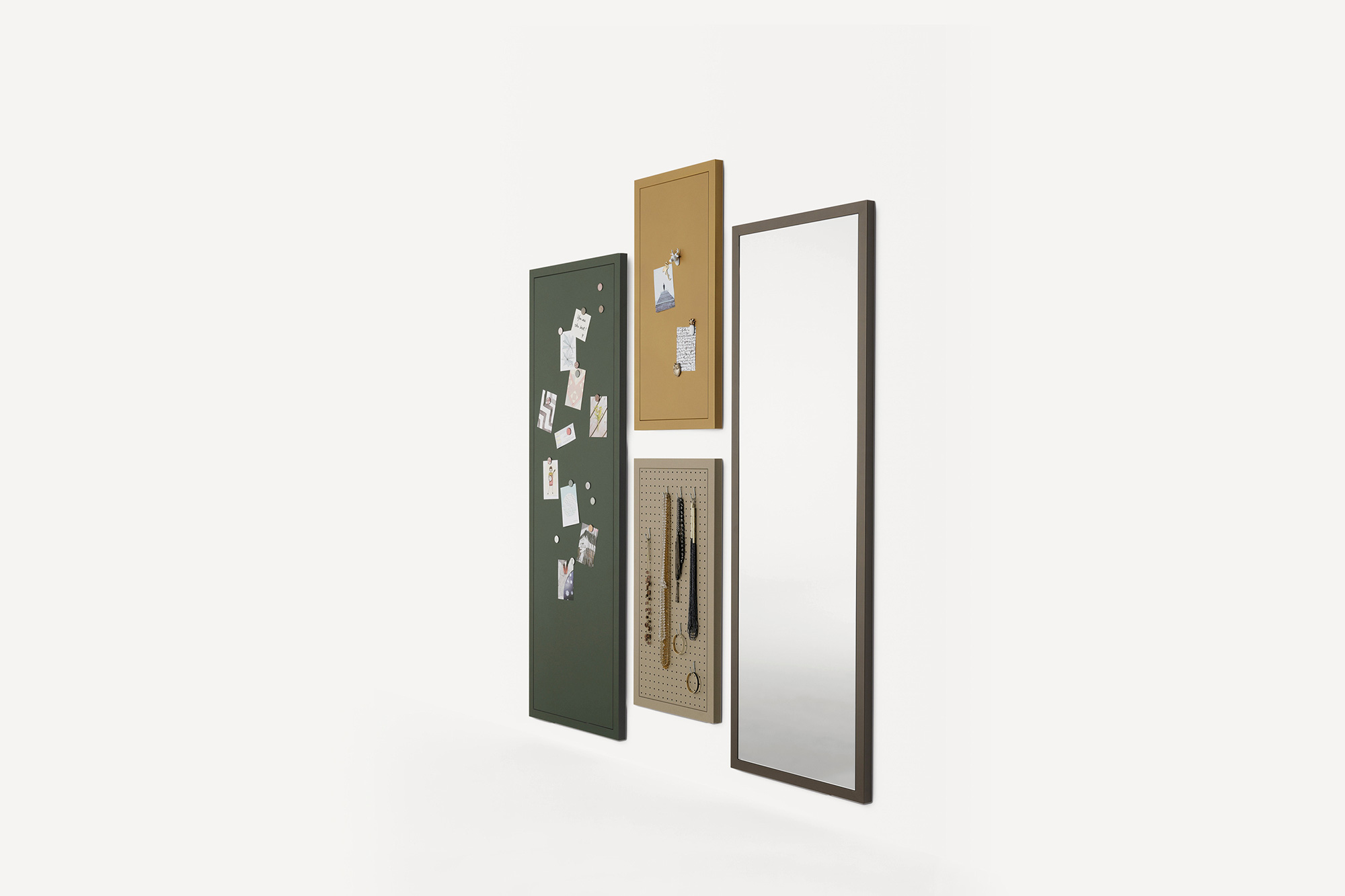 La gamme d’éléments muraux du programme Frame est caractérisée par le cadre en tube carré, destiné à accueillir des miroirs ou des surfaces métalliques pleines et perforées. Celles-ci peuvent être utilisées dans les situations les plus disparates avec l’ajout d’aimants et de crochets. Par ailleurs, les miroirs avec tablettes sont des objets à la forme très simple, mais avec une double fonction intelligente.